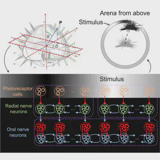 Sea urchins can detect light and move in relation to luminous stimuli despite lacking eyes. They presumably detect light through photoreceptor cells distributed on their body surface. However, there is currently no mechanistic explanation of how these animals can process light to detect visual stimuli and produce oriented movement. Here, we present a model of decentralized vision in echinoderms that includes all known processing stages, from photoreceptor cells to radial nerve neurons to neurons contained in the oral nerve ring encircling the mouth of the animals. In the model, light stimuli captured by photoreceptor cells produce neural activity in the radial nerve neurons. In turn, neural activity in the radial nerves is integrated in the oral nerve ring to produce a profile of neural activity reaching spatially across several ambulacra. This neural activity is readout to produce a model of movement. The model captures previously published data on the behavior of sea urchin Diadema africanum probed with a variety of physical stimuli. The specific pattern of neural connections used in the model makes testable predictions on the properties of single neurons and aggregate neural behavior in Diadema africanum and other echinoderms, offering a potential understanding of the mechanism of visual orientation in these animals.